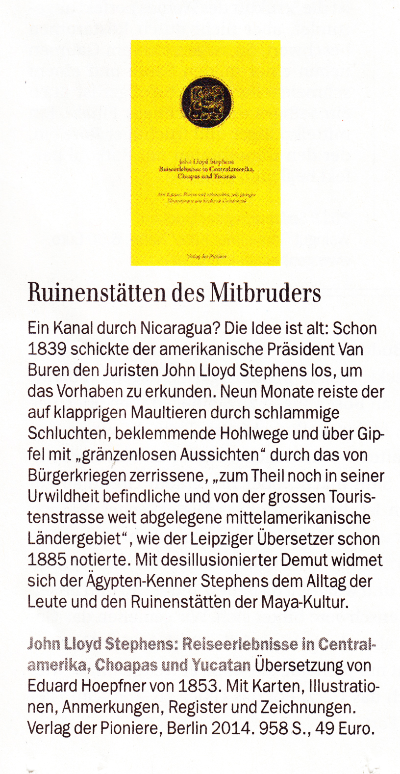 »›Amerika, sagen die Geschichtsschreiber, ward von Wilden bevölkert: Aber Wilde errichteten nimmermehr diese Bauten, Wilde meisselten nimmermehr diese Steine aus.‹ Stephens’ Erkundungen der Maya-Ruinen im 19. Jahrhundert sind spannend, vergnüglich – und hinreißend schön neu editiert, mit Originalzeichnungen von Frederick Catherwood.« (Urs Willmann in der »Zeit« vom 26.2.2015, Beilage Archäologie)